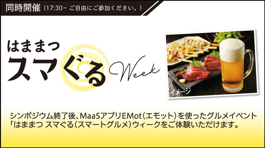 MaaSアプリ「EMot(エモット)」の電子チケット発行機能を活用し、浜松駅周辺の飲食店をアプリで購入したスマホチケットでグルメ巡りをするイベントです。チケット1枚につき、対象の飲食店(30店以上)にて食べ物・飲み物セットをお楽しみいただけます。